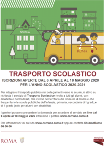 ISCRIZIONE_TRASPORTO XIV MINICIPIO  il termine delle iscrizioni al servizio di trasporto scolastico per l’a.s. 2020-21 è stato differito al  29 maggio 2020