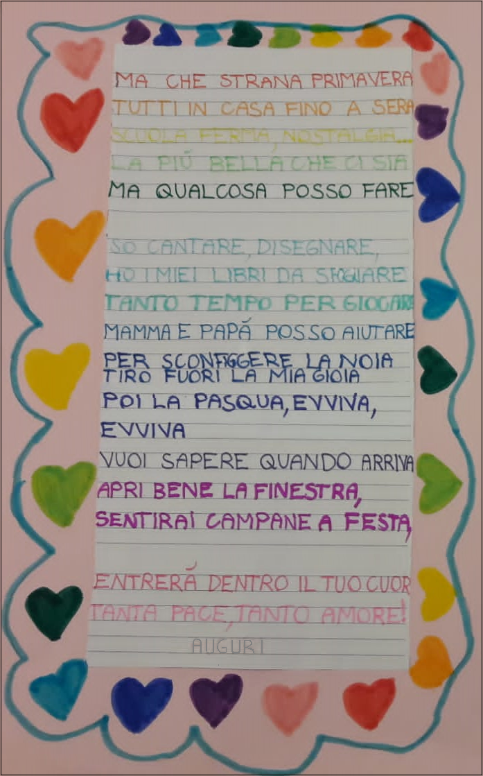 In occasione della Pasqua, le Insegnanti di religione hanno proposto agli alunni della scuola primaria “Tomassetti” e “Isola Farnese” una sola poesia che interpreta molto bene il momento che stiamo vivendo. Questo è un modo per sentirsi tutti uniti.